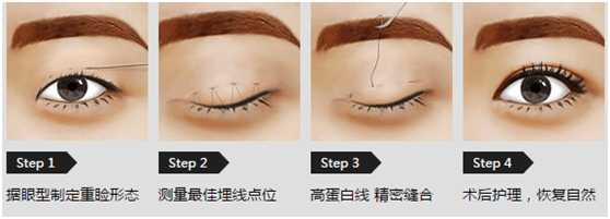 优点:埋线法具有操作简便、创伤小、痕、消肿快、没有需拆线等显著优势,比较适合眼皮较薄、眼裂长、没有皮肤松弛情况的年轻人;对于眼皮较厚,皮肤松弛及年龄较大者不太适合,会有重睑消失的可能。